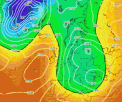 Mappa del geopotenziale a 500hPa e della pressione al livello del mare riferita al giorno 30 ottobre 1974. Si noti la linea guida che caratterizzò praticamente tutto il mese, con l’alta pressione inalberata verso l’alto Atlantico e un lobo del vortice polare bloccato sul Mediterraneo centrale e sull’Italia. Fonte archivio Wetterzentrale.
