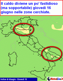 Ecco la nostra mappa estrapolata dalla nostra rubrica dedicata all’indice di disagio da caldo e centrata per giovedì prossimo.