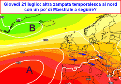 In pratica giovedì 21 luglio potrebbe risultare una giornata instabile sul settentrione, seguita da una leggera ventilazione di Maestrale e subito dopo da un generale ristabilimento, favorito da una nuova spinta verso nord dell’anticiclone.