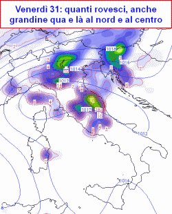 Venerdì il ramo ascendente del getto colpirà soprattutto il Triveneto, senza risparmiare le regioni centrali, ma anche il resto del nord rimarrà coinvolto da una circolazione depressionaria stretta e colma di aria fresca in quota, propensa a favorire nuovi moti verticali, con conseguenti temporali grandinigeni (cumuli a base elevata sul nord-ovest).