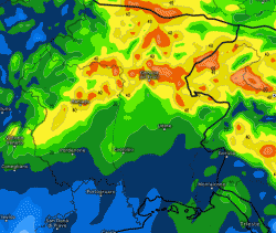 Piogge di una certa consistenza cadranno entro lunedì sera solo sulle estreme Alpi orientali, segnatamente sul Friuli, ecco uno zoom della previsione del modello ad altissima risoluzione, che indica la caduta di oltre 40mm (quantitativo importante ma assolutamente normale per la zona):
