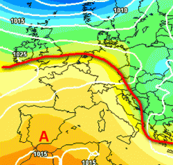 Nella mappa a fianco la situazione prevista per giovedì 10 aprile: l’alta pressione protegge e garantisce il bel tempo gran parte dell’Europa medidionale, compresa l’Italia, con qualche lieve disturbo solo sulla Puglia.