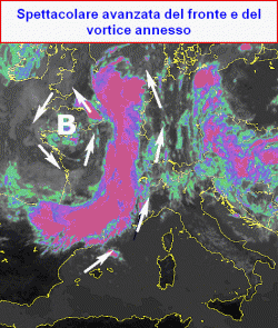 Più che un’immagine di fine luglio, sembra una sequenza autunnale, con una perturbazione che si staglia lungo la verticale della Francia, maestosa ed arcuata, segnale della presenza di una circolazione ciclonica marcata, che infatti si nota molto bene qualche centinaia di km più a nord della Francia, all’altezza di Le Havre, dalla rotazione antioraria di quella nuvolosità fratta, che sottende la formazione di nuovi forti rovesci.