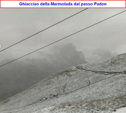 Non solo piogge e temporali, ma anche un po’ di neve. La vediamo nella prima foto sul Passo Padon, con sullo sfondo la Marmolada; siamo ovviamente sulle Dolomiti.