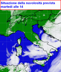 Vi mostriamo la nostra nuova carta della nuvolosità, prevista per martedì alle ore 14 (cliccaci sopra per ingrandirla).