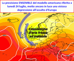 Sull’ovest Europa ritroveremo infatti una figura di bassa pressione che resterà "parcheggiata" su questi settori almeno sino a lunedì 24 luglio. Superata tale data, gli scenari previsionali si fanno più confusi, anche se appare abbastanza probabile un coinvolgimento più netto dei paesi mediterranei da parte delle correnti fresche ed instabili oceaniche, trascinate sui nostri territori dall’irruenza instancabile della depressione ovest europea.