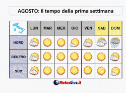 Il tempo dovrebbe comunque tenere in linea di massima anche al settentrione. Solo nel week-end 6-7 agosto potrebbero verificarsi situazioni temporalesche più importanti, estese magari anche alle pianure, ma al centro-sud il sole dovrebbe continuare a splendere incontrastato.
