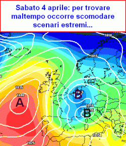 Si attesterebbe intorno a sabato 4 aprile e sarebbe il risultato di un parziale sganciamento verso nord dell’anticiclone azzorriano, in seguito ad una frenata del getto e della formazione di un minimo depressionario al suolo lungo il vertice inferiore della saccatura che andrebbe ad affondare sul nord Italia.