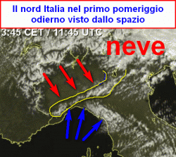 All’occhio del satellite visibile però non sfugge la lunga banda nuvolosa che si sta formando a sud del Po. Si tratta della confluenza tra il Favonio che soffia più a nord (frecce rosse) e le correnti di libeccio che arrivano dal Mar Ligure e svalicano l’Appennino come vento di Marino.