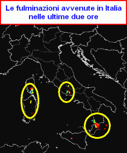 La mappa delle fulminazioni avvenute nelle ultime due ore in Italia ci mostra questo pomeriggio tre zone nevralgiche.