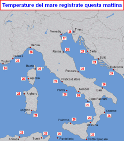 Come si può notare dalla mappa, le temperature del Mare Nostrum risultano abbastanza uniformi e collocate in un intervallo termico molto ristretto (tra i 25 e i 26°).
