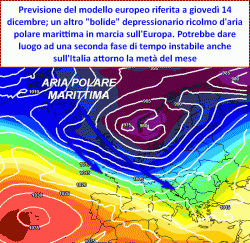 Un breve commento sul modello europeo per comunicarvi ancora delle conferme circa il proseguimento di una fase atmosferca INSTABILE almeno sino alla prima metà di dicembre. A seguito dell’importante perturbazione attesa lunedì 11 dicembre sul Mediterraneo centrale, il tempo non riuscirà a ristabilirsi completamente: l’Europa sarebbe ancora influenzata da una circolazione nord-occidentale che metterebbe in gioco masse d’aria polari marittime. Una seconda controffensiva del maltempo, ancora con un ribasso del Fronte Polare atteso attorno metà mese, prolungherebbe sull’Europa centrale e sul nostro Paese, condizioni atmosferiche inaffidabili.