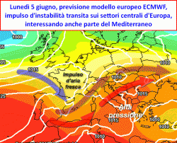 Il cambiamento più importante si farebbe però vedere entro la prima settimana di giugno, attraverso un abbassamento del flusso zonale oceanico che tra domenica 4 e lunedì 5, trascinerebbe sul Mediterraneo un impulso di instabilità un po’ più organizzato. Ritroveremo infatti un’ondulazione della corrente a getto peraltro piuttosto modesta ma forse sufficiente a costruire un sistema frontale associato all’arrivo di qualche temporale che nell’ambito del nostro Paese, andrebbe a colpire segnatamente le nostre regioni settentrionali. (da confermare)