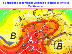 L’evoluzione prevista nella parte conclusiva di maggio sarà contraddistinta da una attenuazione dell’alta pressione che tenderà a divenire più debole soprattutto sui settori centro-occidentali del Mediterraneo. Questo provocherà un’accentuazione dell’instabilità di tipo termoconvettivo con rovesci e temporali che si faranno vedere soprattutto su Alpi e Prealpi.