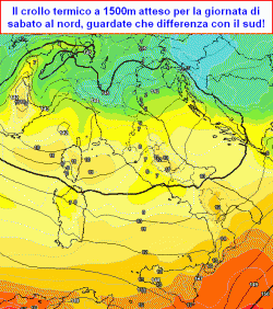 Impressionante la diminuzione delle temperature attesa in pianura al NORD con almeno 5°C (13°C) in meno di massima rispetto a venerdì (18°C) e addirittura 9-10°C in meno rispetto a giovedì (22-23°C).