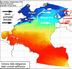 Dove sta la verità? Per il momento gli studi più accreditati confermano la tesi ben nota, favorevole ad un’azione determinante dell’oceano sul clima europeo, ma non per forza dovuti alla Corrente nord atlantica. Non occorrerà inoltre ridisegnare il percorso della Corrente dato che, secondo gli stesso studi, l’attuale fusione della banchisa artica non ha inciso minimamente sull’andamento della medesima.