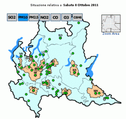 Dopo tre giorni di vento tirato che ha fatto Milano e quella striscia di pianura Padana ventosa come le Bocche di Bonifacio, hanno bloccato il traffico veicolare. Motivo? Le soglie di inquinamento sono state superate per diversi giorni di fila. La mappa dell’ARPA allegata sotto mostra che, grazie al vento, già sabato tutte le centraline lombarde segnalavano PM10 (e tutti gli altri inquinanti) decisamente sotto i livelli di soglia (pallini verdi).