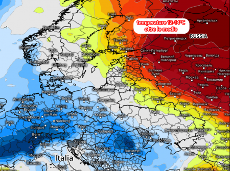 L’anticiclone si è instaurato su tutta la Russia europea, con isoterme a 850 hpa (a circa 1500 metri di quota) addirittura tra i 15 e 17°C. Parliamo di temperature che non sono normali nemmeno in Italia a metà Maggio a quella quota! Questi valori termici in quota si traducono, al suolo, in temperature praticamente estive, ovvero superiori ai 30°C.