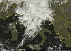 L’immagine satellitare di questo pomeriggio ben ci mostra la perturbazione in azione su gran parte della nostra Penisola.