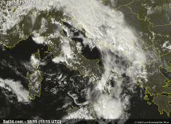 Dall’immagine satellitare di questo pomeriggio si nota il fronte ormai sulle regioni meridionali, che si arcua fino ad interessate le Venezie.