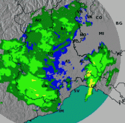 Ecco l’immagine radar che mostra il groppo autorigenerante proprio sulla città di Genova.