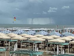 Serie di trombe marine in Versilia: cinque vortici danzano in mare