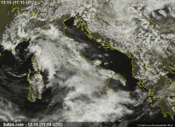 L’immagine sat scattata questo pomeriggio ci mostra i cieli italiani impegnati da molta nuvolosità.