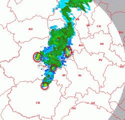 Con i cerchi rossi abbiamo evidenziato le zone dove le precipitazioni erano piu intense.