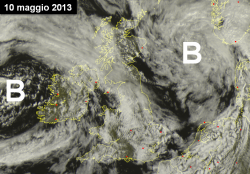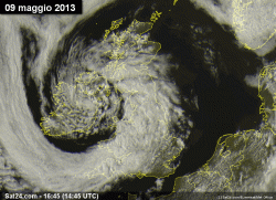 Alcune immagini satellitari riprendono la fervente attività ciclonica che caratterizza queste giornate di maggio su questo lembo di terra in Europa nord-occidentale. La prima immagine si riferisce allo spettacolare vortice ciclonico immortalato dal satellite visibile giovedì 9 maggio. Uno spettacolo che in misura minore si sta ripetendo anche nella giornata odierna con la presenza di ben due vortici di bassa pressione che si susseguono rincorrendosi sui cieli dell’Inghilterra e dell’Irlanda.