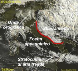 Si evidenziano infatti diversi fenomeni dovuti in particolare alla distorsione orografica delle correnti in atto sul nostro Paese. Al nord scopriamo un’onda orografica dovuta al salto della corrente da nord sulle Alpi. I flussi da nord-est addossano uno sbarramento nuvoloso lungo l’Adriatico, mentre sul Tirreno ritroviamo Foehn appenninico. Infine al sud ecco nubi dovute all’instabilizzazzione dell’aria fredda nel suo scorrimento sul mare.