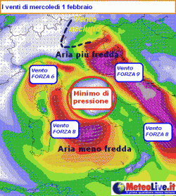 Tutto fa capo all’approfondimento di un minimo depressionario sul Tirreno centrale nella giornata di mercoledì 1 febbraio, il quale ha raggiunto la bellezza di 996hPa. Attorno al minimo si è andata strutturando una perturbazione il cui ramo occluso si è portato sul nostro settentrione fornendo l’innesco per la nevicata di quel giorno su gran parte della val Padana. La manovra di approfondimento del vortice metteva frattanto in moto una intensa azione di risucchio entro il suo core, concretizzatasi con un netto rinforzo del vento da nord-est su tutto il Triveneto.