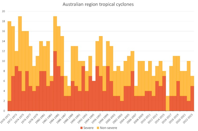 Eppure ci raccontano da sempre che con il riscaldamento globale gli eventi estremi sono destinati ad aumentare. Questo però non si verifica sempre e ovunque; anzi, le eccezioni sono più diffuse di quanto si immagini. Come appunto il numero dei cicloni che si abbattono annualmente sull’Australia, che secondo l’autorevole Ufficio Meteorologico Australiano (BOM), è in progressivo calo negli ultimi 50 anni.