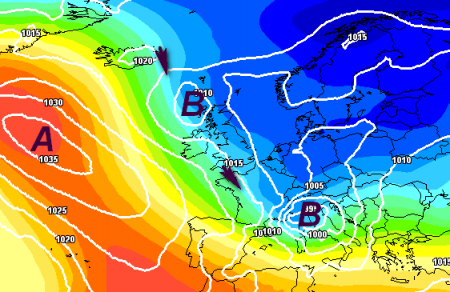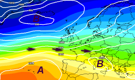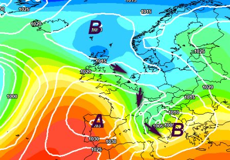 L'anticiclone in posizione particolare: invece che ostacolare il maltempo, potrebbe anche fungere da "scivolo" per ripetuti affondi freddi di tipo invernale, dalle conseguenze anche nevose.