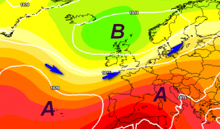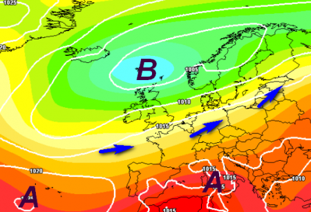 Si nota la presenza di una vasta area depressionaria a nord del Regno Unito che riesce ad abbracciare gran parte dell’Europa centro-settentrionale, sino a coinvolgere anche il nostro settentrione, più a sud invece l’anticiclone riuscirà ad imporsi, ma senza determinare calure eccessive.