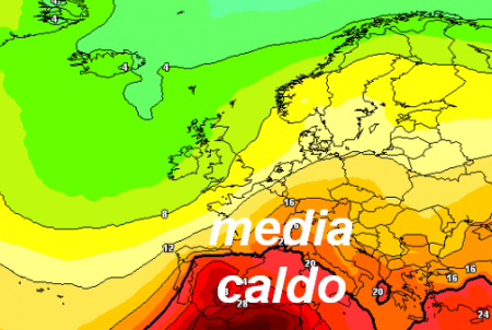 Quella sopra infatti è la previsione termica a 1500m per lunedì 10 luglio, dove si nota l’Europa divisa in 3 settori: il Mediterraneo bollente, il caldo presente anche al centro del Continente e la frescura (anzi il freddo) sul nord Europa, dove già comincerebbe ad influire sulle temperature la diminuita incidenza della radiazione solare e di conseguenza quella della durata del dì.