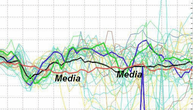 Per dare un’idea del ribaltone modellistico immediato verso la mitezza avvenuto nella giornata odierna, prendiamo in esame due diagrammi incentrati sulla città di Milano. Il primo si riferisce alla previsione imbastita dal modello americano nella serata di ieri, mentre il secondo è la previsione del medesimo modello imbastita questa mattina per il medesimo lasso temporale, ovvero 10-15 giorni. Vi ricordiamo che la linea rossa è la media termica a 1500 metri, mentre le altre linee sono le temperature previste sempre a 1500 metri da tutte le corse perturbatrici che compongono il modello stesso.