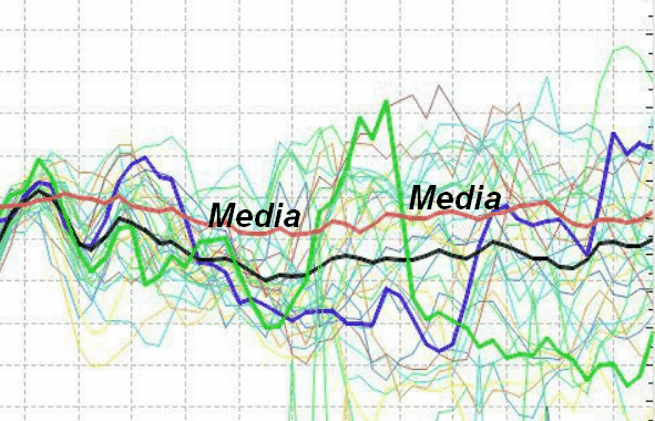 Questo è il diagramma di ieri sera (lunedi 8 gennaio) che mostra molti cluster che puntano a temperature sotto norma nel medio e lungo periodo (si evince un 40% di cluster sopra media ed un 60% sotto media):
