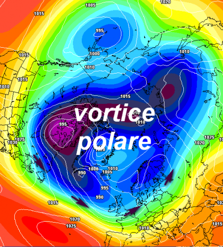 Il vortice polare però si sta organizzando con le sue masse d’aria gelide, come vediamo da questa immagine riferita all’emisfero nord: