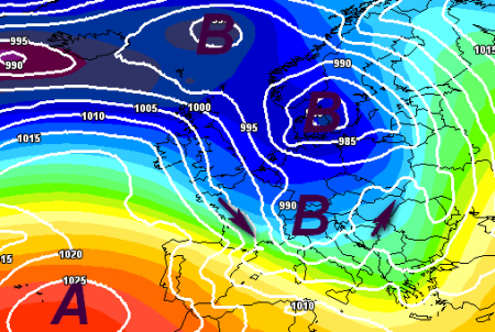 Più si accumula freddo nel nord del Continente e può è probabile che si verifichino questi affondi alla prima vera frenata della corrente a getto; con la mappa qui sopra, prevista da una delle emissioni del modello americano, il limite delle nevicate sulle Alpi si potrebbe abbassare sin sui 1200m e i primi fiocchi cadrebbero anche sulle cime dell’Appennino centro-settentrionale.