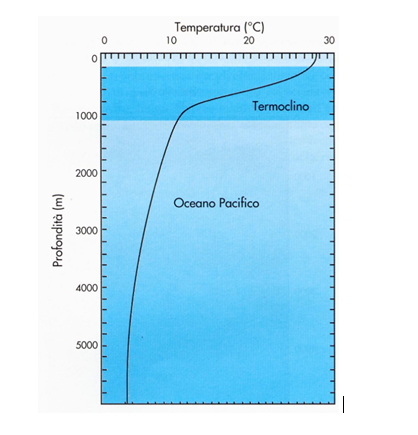 Per riassumere, lo strato più superficiale, circa 100-150m m, presenta una temperatura pressoché costante, con variazioni dell’ordine dei 2-3°C; segue una zona dove la temperatura diminuisce bruscamente (Termoclino), fino a 800-1000m, con un calo anche di 20-25°C, come all’equatore. La diminuzione continua poi procedendo in profondità in modo più graduale, fino ad uno strato omo-termico profondo, al di sotto dei 3500-4000m, dove la temperatura oscilla intorno ai 4°C e dipende più che altro dalla salinità.