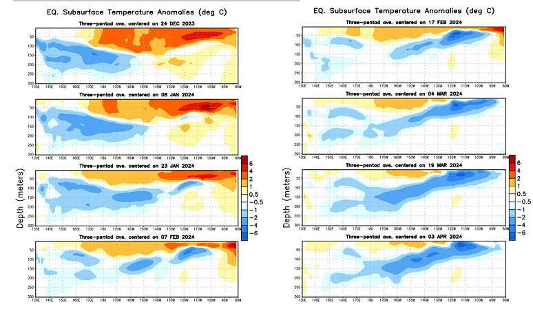 Nel caso del raffreddamento invece, questo è causato pressoché esclusivamente dai fenomeni di upwelling e risalita di acque fredde profonde, come si può notare nelle più recenti restituzioni della NOAA (sequenze degli ultimi 3-4 mesi), riguardo alla distribuzione delle masse d’acqua sub-superficiali. Si nota come l’acqua più fredda tenda a scalzare e a sostituire l’acqua più calda, a partire da est, ovvero dalle coste del Sudamerica.