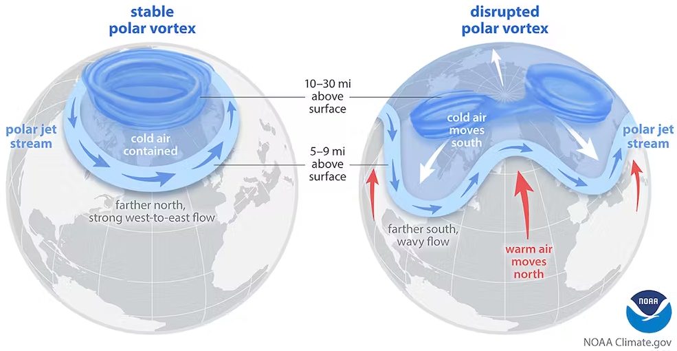 Ma ora la NOAA (National Oceanic and Atmospheric Administration – uno dei più autorevoli enti di ricerca mondiali in campo meteo-climatico) ha trovato la “spiegazione” nell’instabilità del vortice polare stratosferico. Negli ultimi decenni questa figura dell’alta atmosfera e delle latitudini più remote sarebbe sempre più “disturbato”, e provocherebbe una maggiore ondulazione della corrente a getto, che a sua volta causerebbe alternanze di freddo e caldo sempre più estreme, in un panorama di riscaldamento globale sempre più attivo.