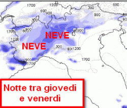 Tra la notte e la prima mattinata di domani avremo il massimo sviluppo della nevicata. Guardate la cartina qui di fianco. Gli accumuli non saranno importanti, tuttavia una discreta nevicata avrà fatto cambiare aspetto al paesaggio di Piemonte e Lombardia, che assumerà una connotazione natalizia non solo virtuale.