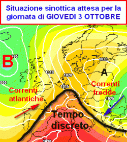 La cartina che vedete di fianco inquadra abbastanza bene la situazione sinottica attesa per la giornata di giovedì 3 ottobre.