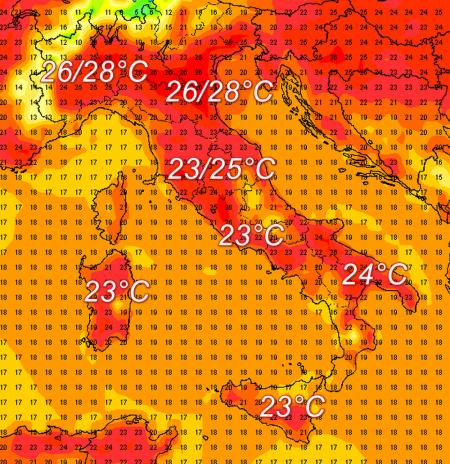 Qui sotto vi mostriamo invece le temperature massime previste dal modello americano GFS nella giornata di mercoledì 11, uno dei momenti più caldi dell’intera settimana:
