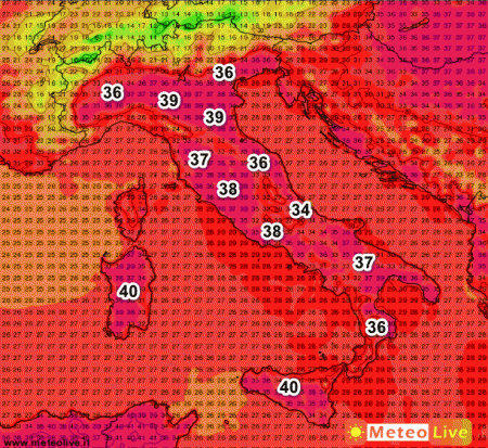 I 40° saranno presenti sulle Isole, ma non potranno essere esclusi sull’Emilia Romagna e le aree interne del centro e del sud. I valori termici saranno quasi ovunque superiori a 35° salvo poche e locali eccezioni. Come abbiamo anticipato, le temperature si manterranno immutate anche nella giornata di martedi 5 luglio, poi inizierà una benaugurante discesa.