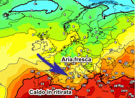 Notiamo l’isoterma + 20° a 1500 metri, che è il confine tra il caldo sopportabile e atroce, abbandonare le estreme regioni meridionali. Da nord-ovest dovrebbe affluire aria meno calda che spazzerà via la canicola e l’afa dall’Italia. Non aspettatevi il fresco, ma solo un caldo decisamente più sopportabile ed una maggiore variabilità del tempo con qualche temporale rinfrescante qua e la.