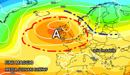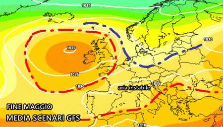 Analizzando la previsione del centro americano, emerge la possibilità che un vasto fiume d’aria fresca nord-europea possa affondare sin sul Mediterraneo centro-occidentale, dando vita ad una forte ondata di maltempo tra 29 e 31 Maggio, proprio sul finire della Primavera meteorologica. Questa perturbazione seguirebbe la breve fase temporalesca del 24-25 Maggio (ormai confermata). Insomma per l’anticiclone sembra davvero esserci ben poco spazio, mentre per le perturbazioni le porte sono fin troppo spalancate.