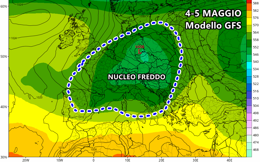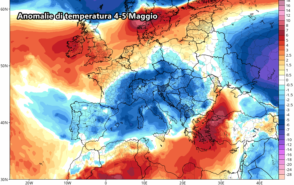 Questa perturbazione porterà ad un calo netto delle temperature sui valori leggermente inferiori alle medie del periodo e inoltre porterà anche tante piogge e locali forti temporali. Successivamente, attorno al 3 e al 4 maggio, questa perturbazione si isolerà all’interno del Mediterraneo e riuscirà addirittura a richiamare a sé correnti ben più fredde provenienti dai quadranti settentrionali.