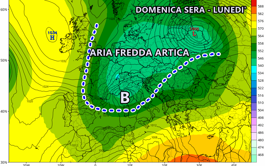 Un nucleo di aria fredda di origine artica si sta dirigendo sull’Europa centrale e entro la sera di domenica raggiungerà il Nord Italia dove darà vita a una depressione, precisamente sul Mar Ligure, che dispenserà precipitazioni diffuse su gran parte del settentrione e del Medio Alto Tirreno. Il minimo di bassa pressione si posizionerà nel punto più ideale per favorire l’arrivo di precipitazioni su tutto il nord-ovest, soprattutto sui settori come l’Emilia, la Lombardia e il Piemonte. Le correnti più umide provenienti da est e sud-est apporteranno precipitazioni tra domenica sera e lunedì, favorendo anche un costante calo della quota neve che rischia di portarsi addirittura fino a quote pianeggianti su alcuni territori del nord-ovest.